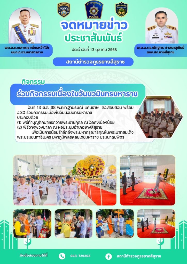 วันที่ 13 ตุลาคม 2568 เวลา 07.00 น. พ.ต.อ.ดร.พัทฐกร ศาสนะสุพินธ์ ผกก.สภ.ยางสีสุราช มอบหมายให้ พ.ต.ท.ฐานธิษณ์ แดนราษี สว.สอบสวน พร้อม ว.30 ร่วมกิจกรรมเนื่องในวันนวมินทรมหาราช