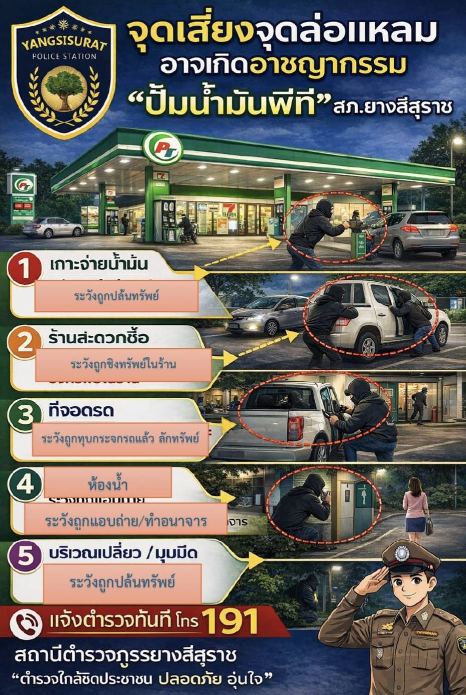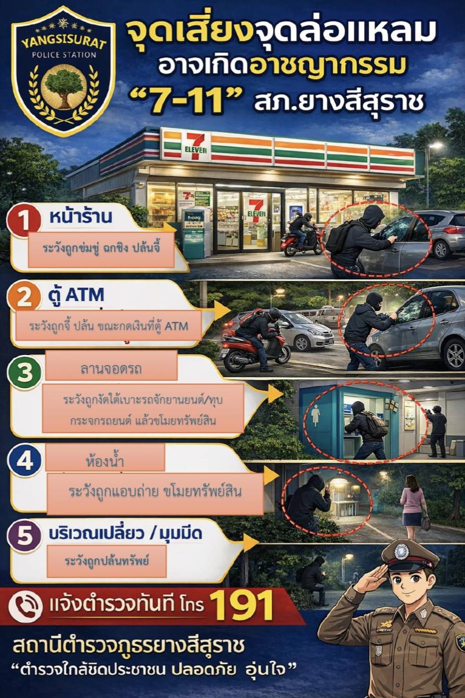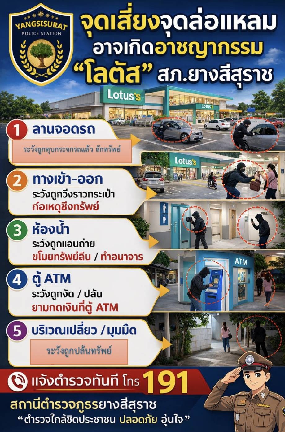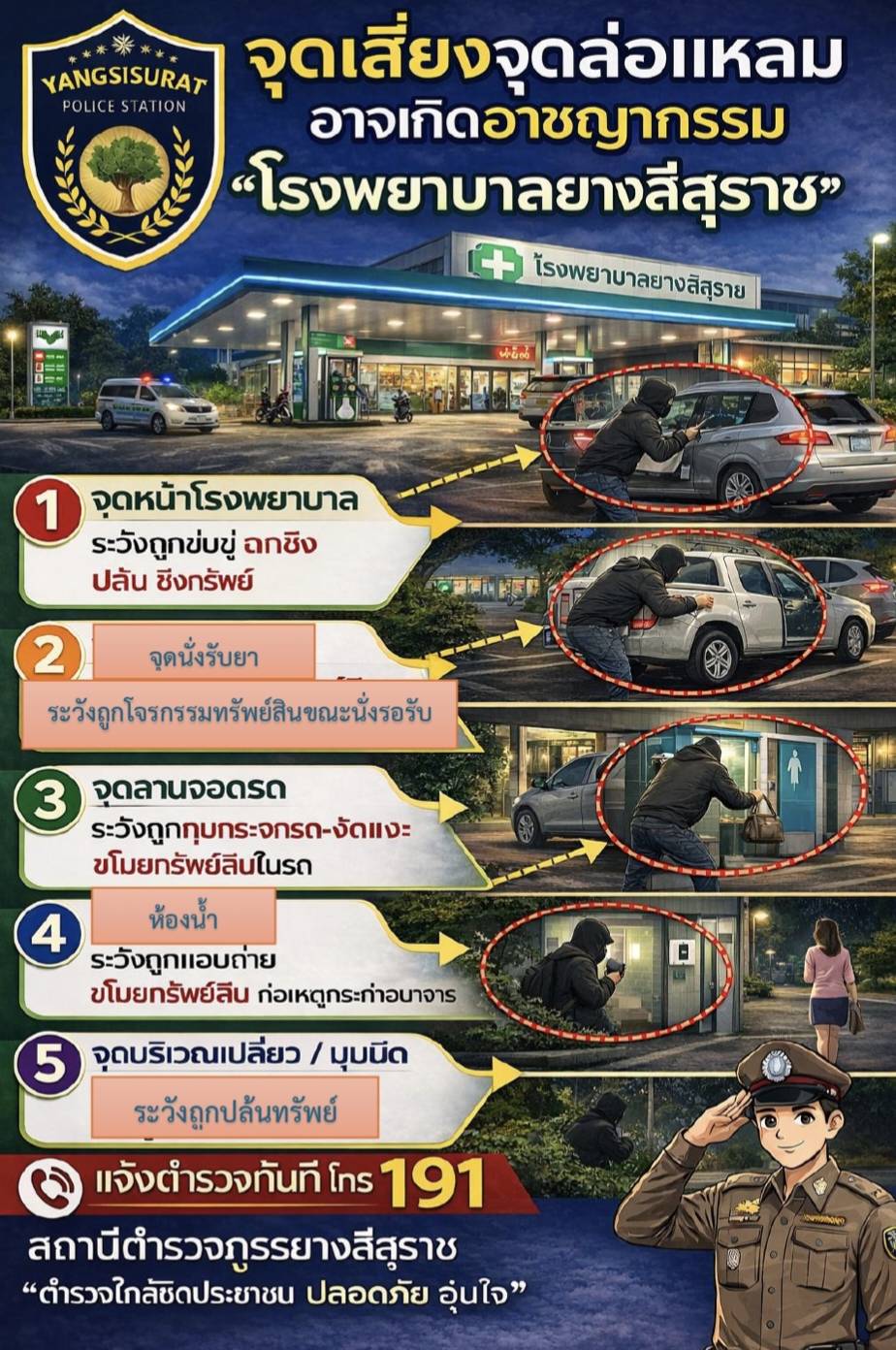 สถานีตำรวจภูธรยางสีสุราช ขอประชาสัมพันธ์ให้ประชาชนในพื้นที่รับทราบถึง จุดเสี่ยงและจุดล่อแหลมที่อาจเกิดเหตุอาชญากรรม ภายในพื้นที่รับผิดชอบ เพื่อเป็นการสร้างการรับรู้และเสริมสร้างความระมัดระวังในชีวิตและทรัพย์สินของประชาชน 17 มีนาคม 2569 โดย yangsisurat / ข่าวประชาสัมพันธ์ ทั้งนี้ เพื่อให้ประชาชนตระหนักถึงภัยอันใกล้ตัวที่อาจเกิดขึ้นได้ และสามารถป้องกันตนเองจากเหตุอาชญากรรมในรูปแบบต่าง ๆ ได้อย่างเหมาะสม หากพบเห็นเหตุผิดปกติหรือเหตุอันควรสงสัย สามารถแจ้งเจ้าหน้าที่ตำรวจได้ทันที แจ้งเหตุด่วนเหตุร้าย โทร 191 สถานีตำรวจภูธรยางสีสุราช “ตำรวจใกล้ชิดประชาชน ปลอดภัย อุ่นใจ” FacebookFacebookXXLINELine