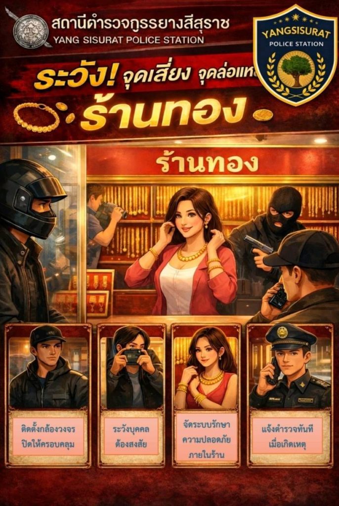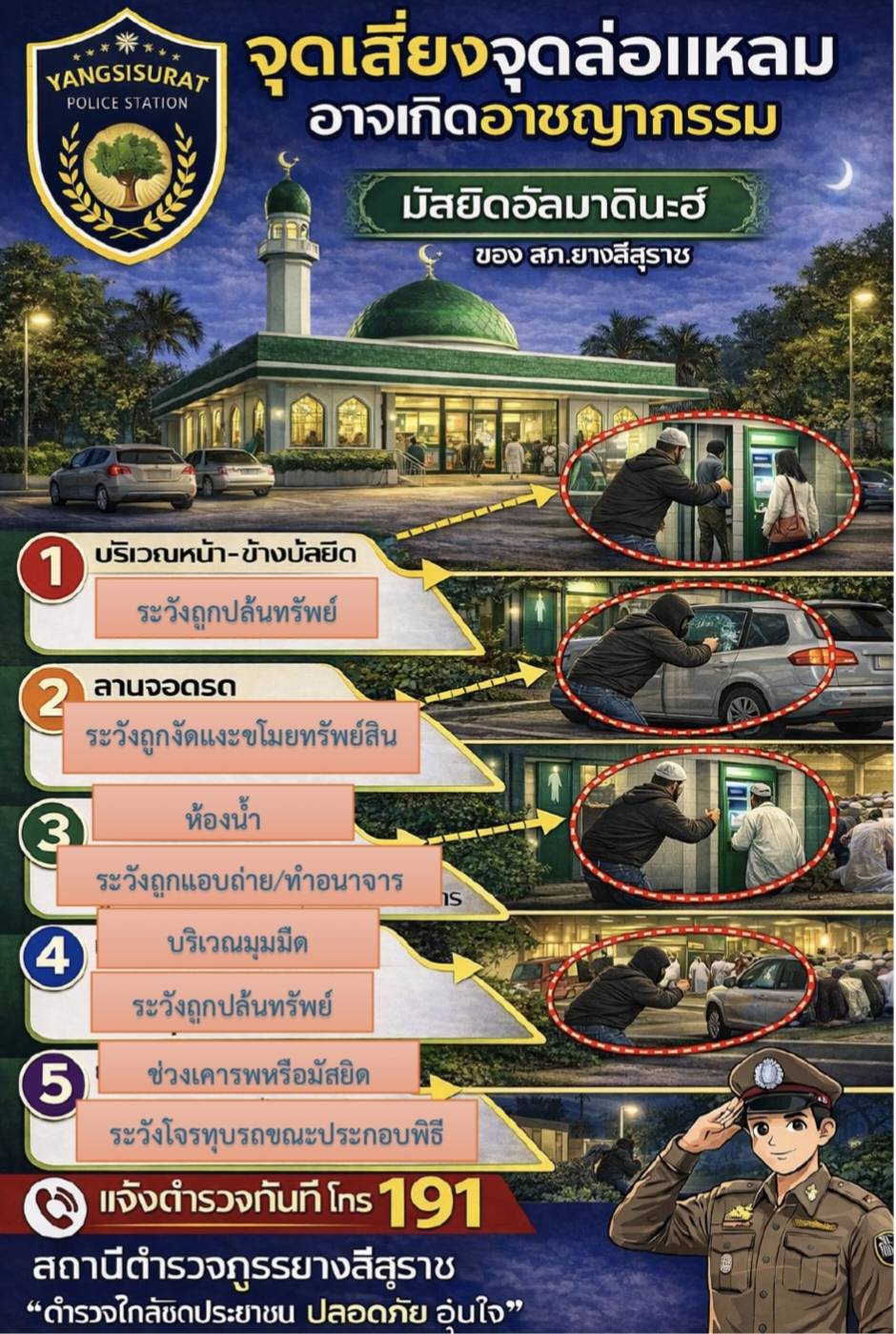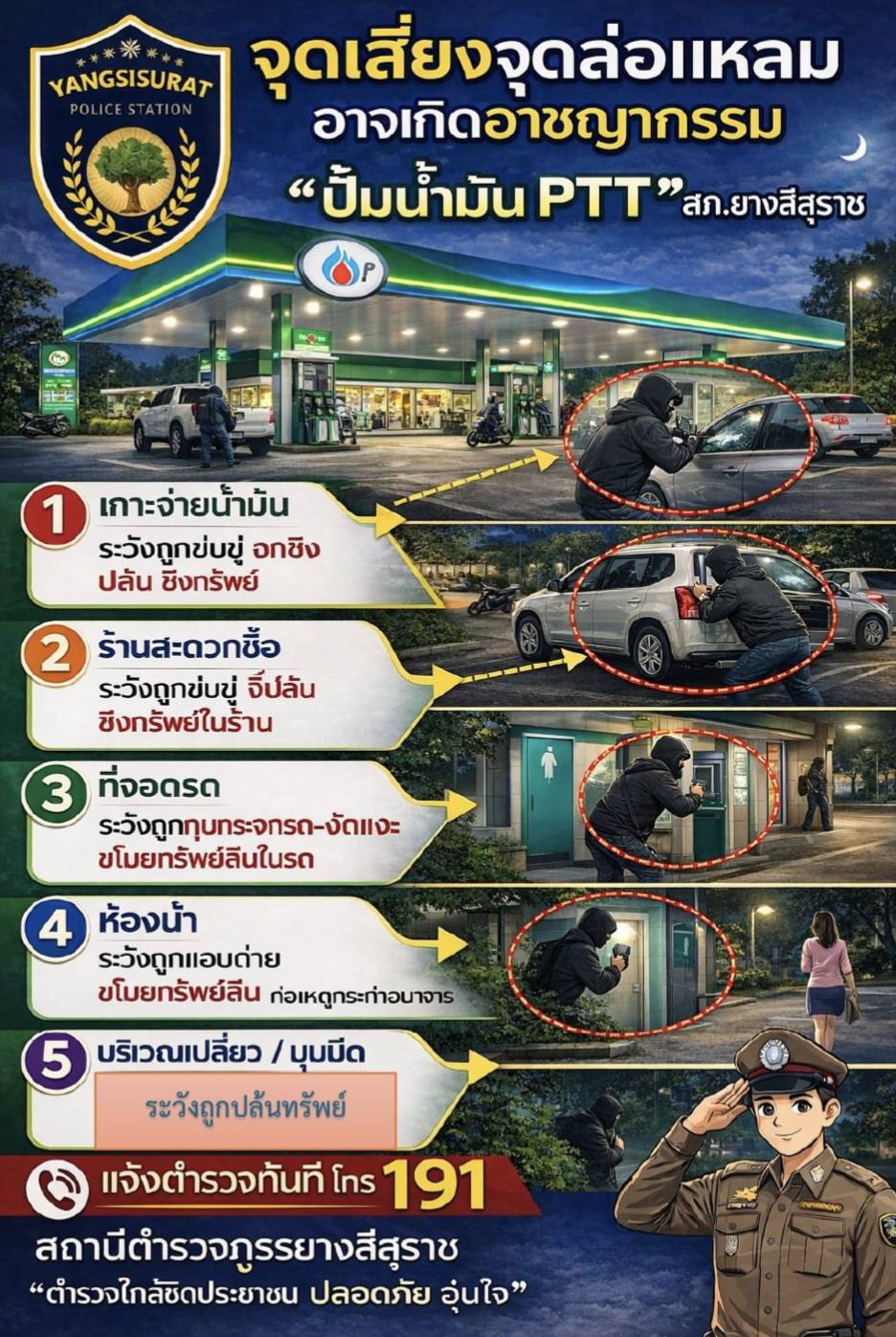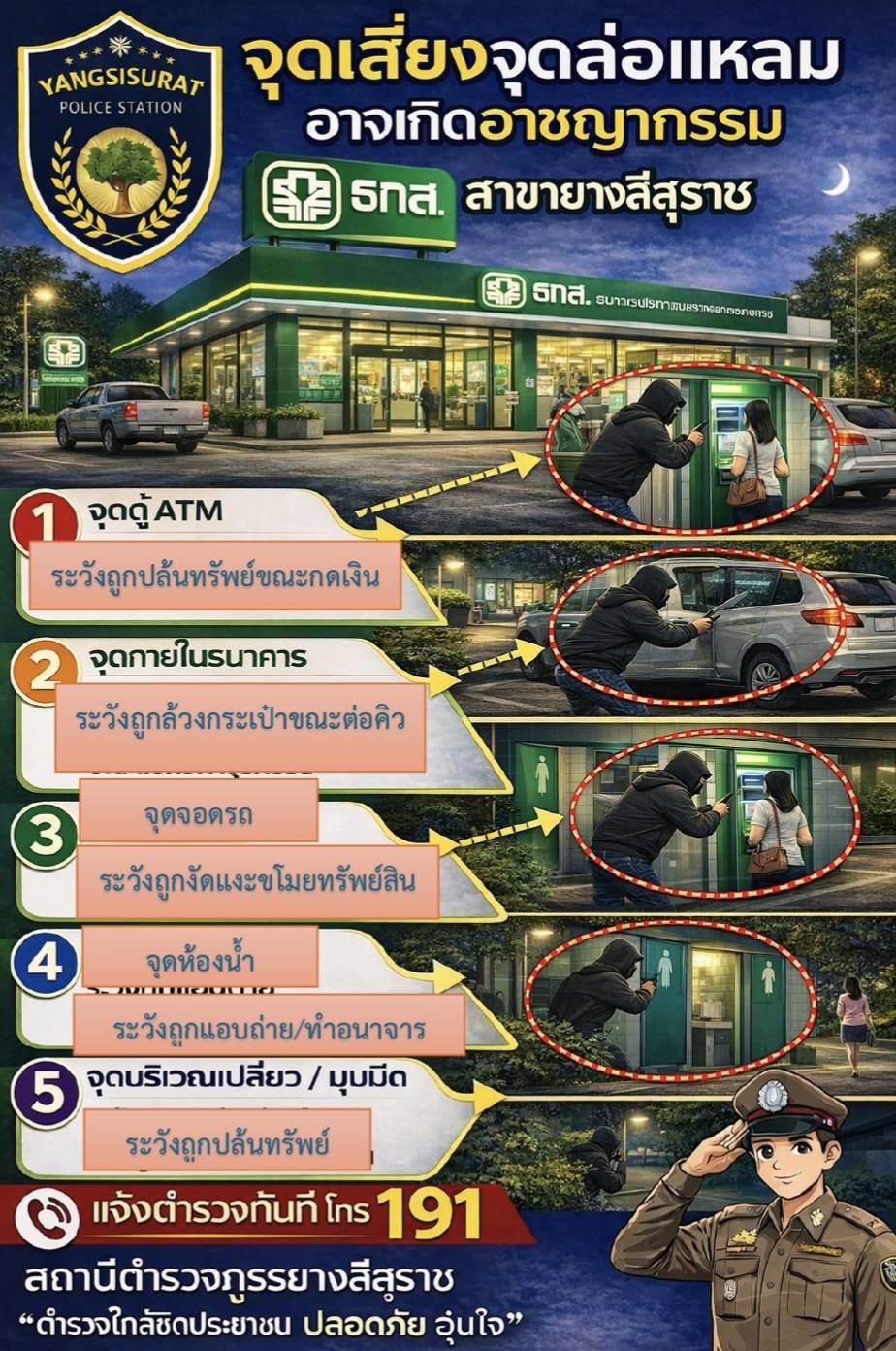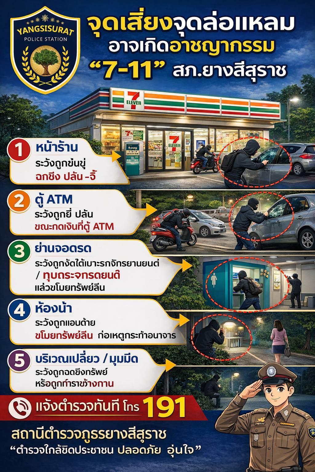 สถานีตำรวจภูธรยางสีสุราช ขอประชาสัมพันธ์ให้ประชาชนในพื้นที่รับทราบถึง จุดเสี่ยงและจุดล่อแหลมที่อาจเกิดเหตุอาชญากรรม ภายในพื้นที่รับผิดชอบ เพื่อเป็นการสร้างการรับรู้และเสริมสร้างความระมัดระวังในชีวิตและทรัพย์สินของประชาชน 17 มีนาคม 2569 โดย yangsisurat / ข่าวประชาสัมพันธ์ ทั้งนี้ เพื่อให้ประชาชนตระหนักถึงภัยอันใกล้ตัวที่อาจเกิดขึ้นได้ และสามารถป้องกันตนเองจากเหตุอาชญากรรมในรูปแบบต่าง ๆ ได้อย่างเหมาะสม หากพบเห็นเหตุผิดปกติหรือเหตุอันควรสงสัย สามารถแจ้งเจ้าหน้าที่ตำรวจได้ทันที แจ้งเหตุด่วนเหตุร้าย โทร 191 สถานีตำรวจภูธรยางสีสุราช “ตำรวจใกล้ชิดประชาชน ปลอดภัย อุ่นใจ” FacebookFacebookXXLINELine
