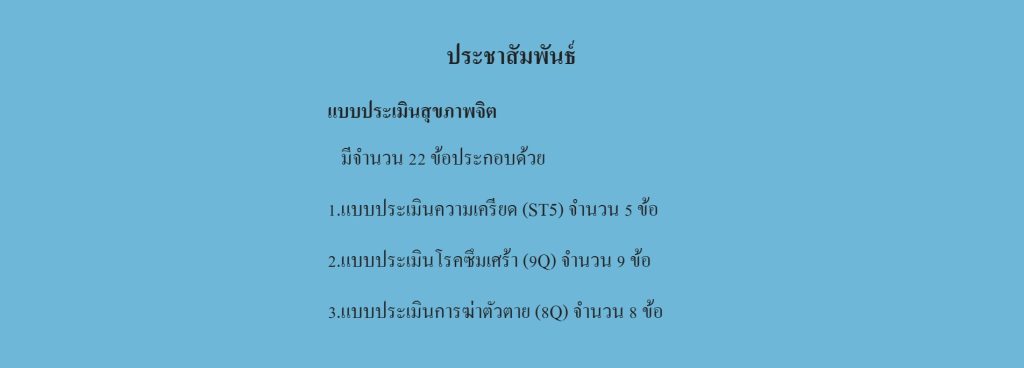 แจ้งประชาสัมพันธ์ช่องทางทดสอบสุขภาพจิตด้วยตนเองของโรงพยาบาลตำรวจ 17 มีนาคม 2569 โดย yangsisurat / ข่าวประชาสัมพันธ์ โดยสามารถติดต่อ รพ.ตร.สายด่วน Depress We Care หมายเลข 08 1932 0000 หรือขอคำปรึกษาผ่านเพจ Facebook “Because Depress We Care” และสายด่วนสุขภาพจิต 1323 หรือทาง https://pmhs.police.go.th/ FacebookFacebookXXLINELine